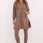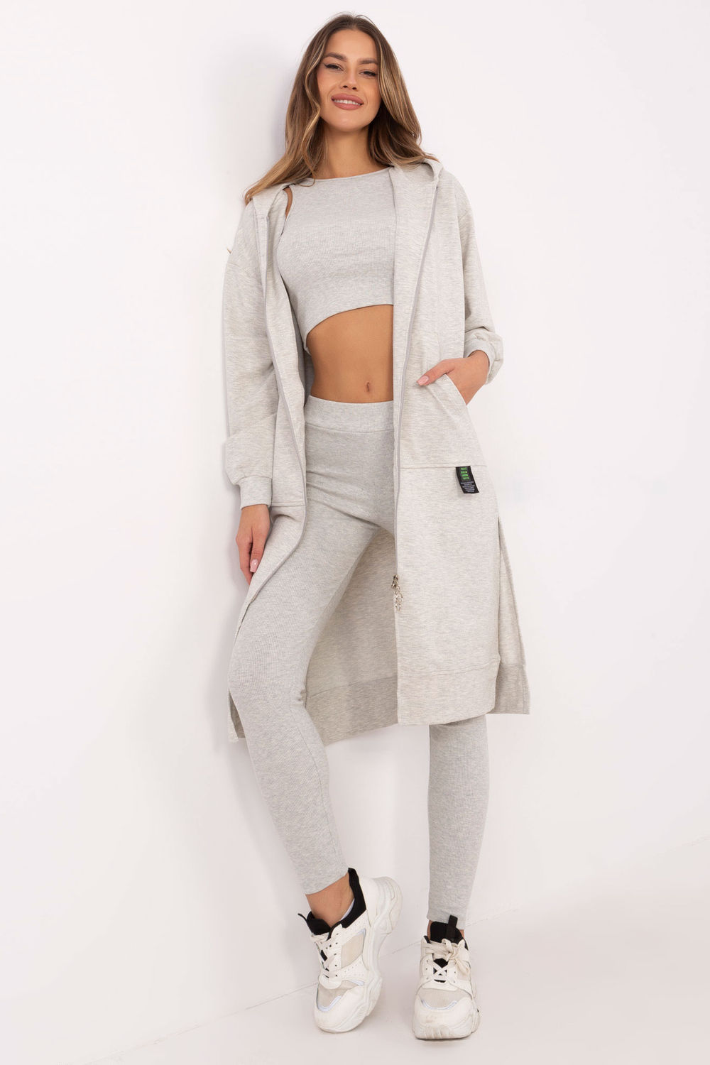 Komplet damski składający się z bluzy, topu i legginsów to harmonijne połączenie stylu casualowego i sportowego. Stworzony z myślą o codziennym komforcie i aktywności, doskonale sprawdzi się zarówno podczas treningu, jak i w trakcie relaksu. Bluza o przedłużonym kroju to praktyczne rozwiązanie na chłodniejsze dni. Zapinana na zamek błyskawiczny i wyposażona w wsuwane kieszenie, zapewnia wygodę i funkcjonalność. Wykonana z mieszanki bawełny, poliestru i elastanu, łączy miękkość z elastycznością. Długi rękaw oraz kaptur dodatkowo chronią przed wiatrem i chłodem. Top o okrągłym dekolcie jest prosty, a zarazem uniwersalny, idealnie dopasowany do całego zestawu. Jego skład z bawełny i elastanu gwarantuje przewiewność i komfort noszenia. Legginsy o zwężanych nogawkach i wysokim stanie podkreślają sylwetkę, jednocześnie zapewniając pełną swobodę ruchu. Wykonane z bawełny i elastanu, cechują się elastycznością i trwałością. Dodatkowym wyróżnikiem jest prążkowana struktura materiału, która nadaje im wyjątkowego charakteru. Całość utrzymana w gładkim wzorze, doskonale wpisuje się w codzienny, sportowy look, oferując zarówno styl, jak i maksymalny komfort użytkowania.