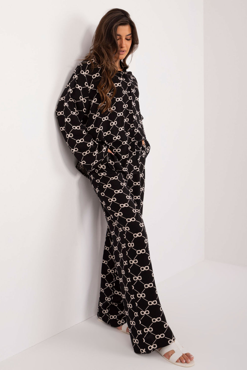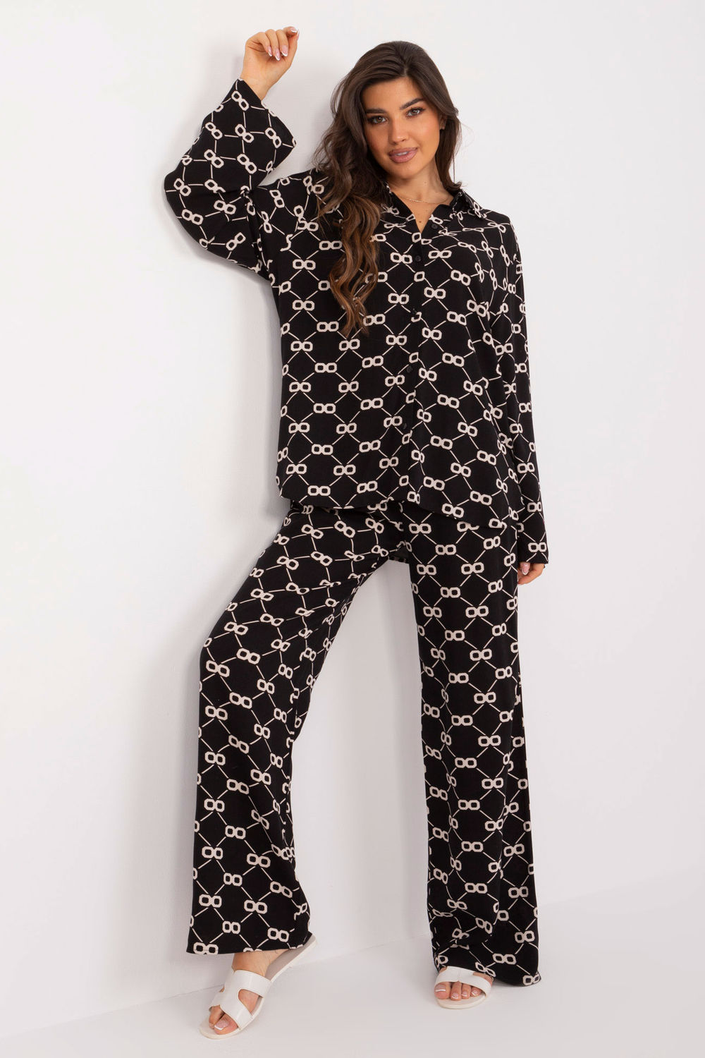 Odkryj letni komplet damski, który składa się z eleganckiej koszuli i wygodnych spodni. Ten zestaw jest idealnym wyborem na codzienne wyjścia, oferując połączenie komfortu i stylu. Elegancka koszula zapinana na guziki, co ułatwia jej zakładanie i zdejmowanie. Dodatkowy pasek do wiązania w talii, który podkreśla sylwetkę i dodaje uroku. Koszula posiada długie rękawy, co sprawia, że jest odpowiednia na chłodniejsze dni. Klasyczny kołnierzyk dodaje koszuli formalnego charakteru, który doskonale balansuje z jej casualowym stylem. Spodnie wyposażone są w wiązanie w pasie, które pozwala na idealne dopasowanie do sylwetki. Proste nogawki sprawiają, że spodnie są uniwersalne i pasują do wielu stylizacji. Wysoki stan zapewnia komfort i podkreśla talię. Praktyczne, wsuwane kieszenie boczne dodają funkcjonalności i wygody. Komplet zdobiony jest oryginalnym nadrukiem, który przyciąga wzrok i dodaje świeżości każdej stylizacji.