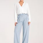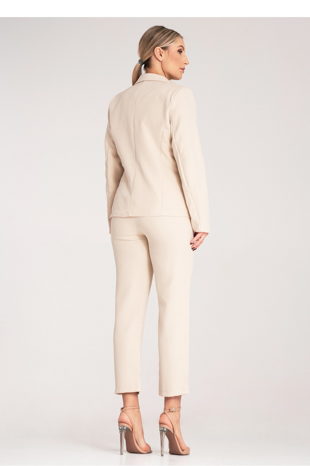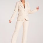 Elegancki komplet damski. Klasyczna marynarka zapinana na jeden guzik i dopasowane spodnie z wysokim stanem oraz kieszeniami.