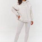 Ten komplet dresowy to idealny wybór dla kobiet, które cenią funkcjonalność i styl. Zestaw składa się z oversizowej bluzy z długimi rękawami oraz luźnych spodni, które tworzą komfortową, ale stylową całość. Dzięki szerokiemu krojowi, spodnie zapewniają pełną swobodę ruchów, a elastyczny pas dopasowuje się do sylwetki. Dodatkowo są poszerzane ku dołowi nadając zestawowi wyjątkowy i dynamiczny charakter. Bluza z klasycznym okrągłym dekoltem i rękawami zakończonymi ściągaczami dopełnia całość, tworząc wygodny i ciekawy komplet. Dres wykonany z miękkiego i przyjemnego w dotyku materiału dresowego, który zapewnia komfort każdego dnia. Dzięki prostemu, ale efektownemu krojowi, zestaw świetnie sprawdzi się w różnych sytuacjach. Nasz komplet dresowy to wybór, który łączy luz, funkcjonalność i nowoczesny wygląd. Sprawdzi się zarówno na relaks w domu, jak i na spotkania z przyjaciółmi, zakupy czy na co dzień. Zestaw idealnie komponuje się z ulubionymi sneakersami, tworząc stylową, wygodną i modową stylizację.