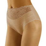 Zgrabne, nieco wyższe stringi, skomponowane w bardzo ciekawy sposób. Oparte na grze kontrastu – koronki i subtelnej dzianiny w prążek, które wspólnie tworzą ciekawy miks.