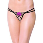 Koronkowe stringi z pęknięciem w kroku. Przyciągające uwagę wycięcie między pośladkami. Model typu open crotch.