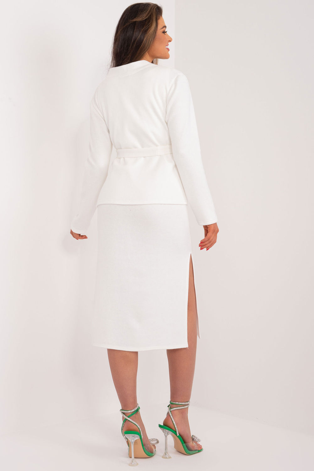 Komplet sweter plus sukienka to doskonała propozycja dla kobiet ceniących zarówno wygodę, jak i styl w codziennych sytuacjach, a także w trakcie pracy. Oba elementy tego zestawu prezentują się niezwykle efektownie, tworząc harmonijny i zgrany look. Sukienka o okrągłym dekolcie, bez rękawów, emanuje swobodą i lekkością, idealnie pasując do codziennego stylu. Rozcięcia po bokach u dołu sukienki nadają jej nieco nonszalancji, jednocześnie pozostając w zgodzie z aktualnymi modowymi trendami. Sweter, który stanowi dopełnienie kompletu, posiada długi rękaw, co sprawia, że jest idealnym wyborem na chłodniejsze dni. Pasek dołączony do swetra stanowi elegancki detal, jednocześnie łącząc oba elementy w spójną całość. Wzór dominujący to gładka powierzchnia, co czyni komplet uniwersalnym i łatwym do zestawienia z innymi elementami garderoby. Styl casual sprawia, że zestaw ten jest świetnym wyborem na różnorodne okazje, zarówno do pracy, jak i na codzienne spacery czy spotkania z przyjaciółmi. Ten komplet sweter plus sukienka to propozycja dla kobiet pragnących połączyć komfort noszenia z modowym wyrazem, tworząc jednocześnie stylowy i funkcjonalny zestaw, który sprawdzi się w różnych sytuacjach.