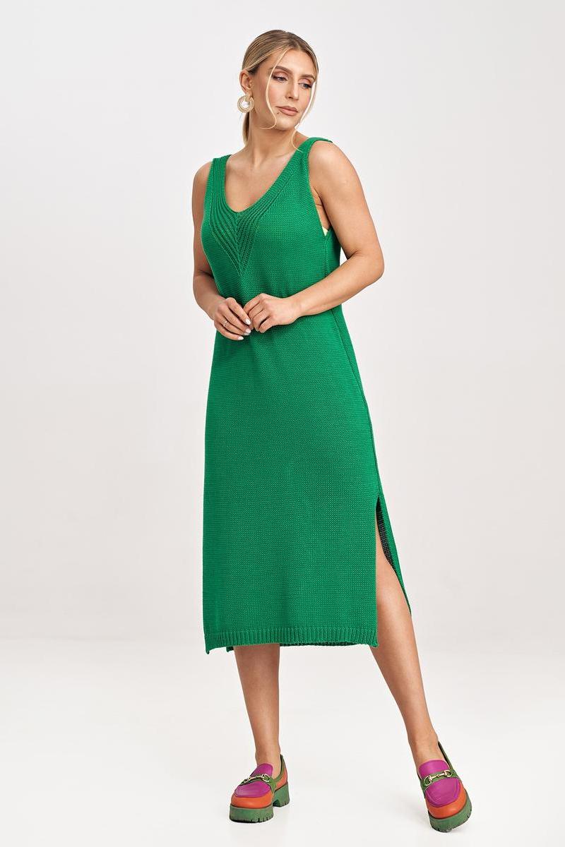 Komplet dwuczęściowy składający się z midi sukienki oraz bolerka. Bolerko z długim rękawem, niezapinane z ozdobną kokardą na przodzie. Sukienka na grubych ramiączkach oraz głębokim dekoltem.