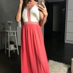 Prosta sukienka bez rękawków z odkrytymi plecami. W talli baskinka oraz ozdobne kamienie i cekiny.