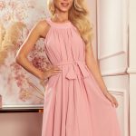 Koronkowa sukienka z dekoltem i krótkim rękawkiem. Sukienka w kolorze malinowym. Sukienka klasyczna i elegancka. Produkcja polska. Marka Numoco.