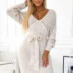 Szyfonowa plisowana sukienka z dekoltem, falbankami na ramionach i kokardką w pasie. Sukienka w kolorze granatowym. Marka numoco. Produkcja europejska.
