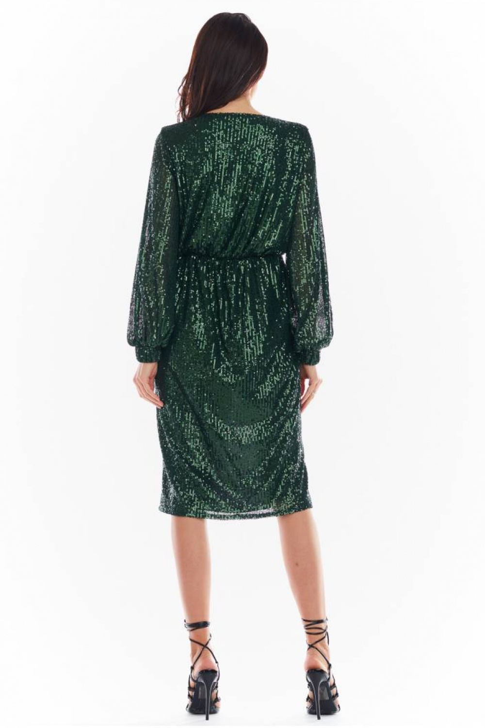 Sukienka uszyta z materiału w cekiny. Kopertowy dekolt nadaje jej kobiecy charakter. Kopertowy dół sukienki pozwala wyeksponować nogi. Długie, szerokie, lejące rękawy zakończone mankietem z gumką. Elastyczna gumka w talii zapewnia idealne dopasowanie do sylwetki. Sukienkę wyprodukowano w Polsce