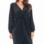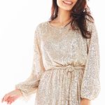 Sukienka uszyta z materiału w cekiny. Szerokie, lejące rękawy zakończone mankietem z gumką. Można ją nosić na dwa sposoby, z taśmą w talii lub bez. Dołączana taśma w talii uszyta z tego samego materiału co sukienka. Sukienkę zaprojektowano i uszyto w Polsce