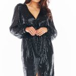 Kopertowa góra sukienki pięknie eksponuje dekolt. Gumka w talii dopasowuje się do sylwetki. Długie rozszerzające się ku dołowi rękawy zakończone mankietem. Zakładany dół sukienki pięknie eksponuje nogi. Sukienka uszyta z miękkiego i elastycznego weluru. Zaprojektowano i uszyto w Polsce.
