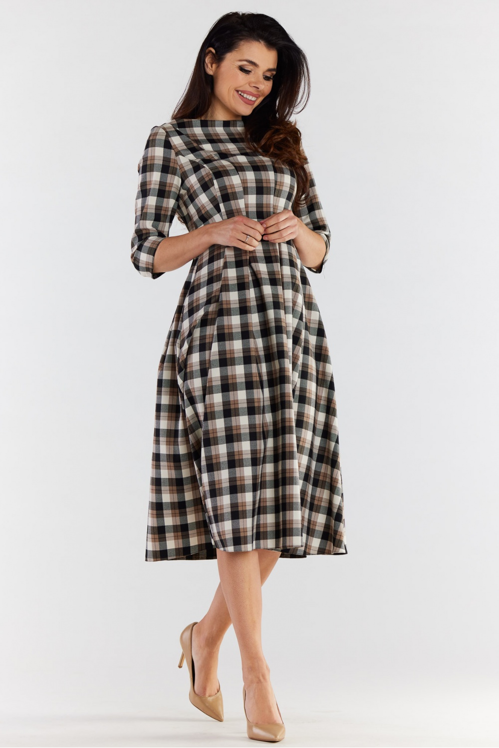 Rozkloszowana sukienka midi z rękawem 3/4, zapinana na kryty zamek. Uszyta z tkaniny w modną kratę. Fason sukienki optycznie modeluje sylwetkę i podkreśla kobiecość. Idealna zarówno na rodzinne uroczystości, jak i na służbowe spotkania w biurze. Zaprojektowano i uszyto w Polsce.