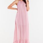 Długa sukienka z szyfonu na elastycznej podszewce z dwoma falbanami na dole i gumką w pasie. Rękawki 3/4 z gumką na dole. Przy dekolcie gumka podtrzymująca.