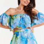 Luźna sukienka z szyfonu na elastycznej podszewce, z dwiema falbanami na dole i małymi falbanami przy rękawach.