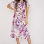 Długa sukienka z szyfonu na elastycznej podszewce z rozcięciami na dole po lewej stronie. Sukienka w dekolcie i pasie z gumką w celu dopasowania do sylwetki. Rękawki 3/4 również z gumką.