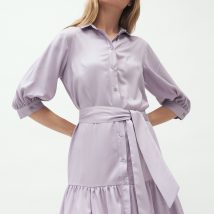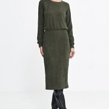 Damska sukienka o trapezowym kroju z delikatnie przedłużonym tyłem. Sukienka posiada długi rękaw zakończony gumką. Sukienka sprawdzi się jako stylizacja codzienna a także wieczorowa, do kawiarni, na spotkanie z przyjaciółką. Produkt wyprodukowany i uszyty w Polsce.