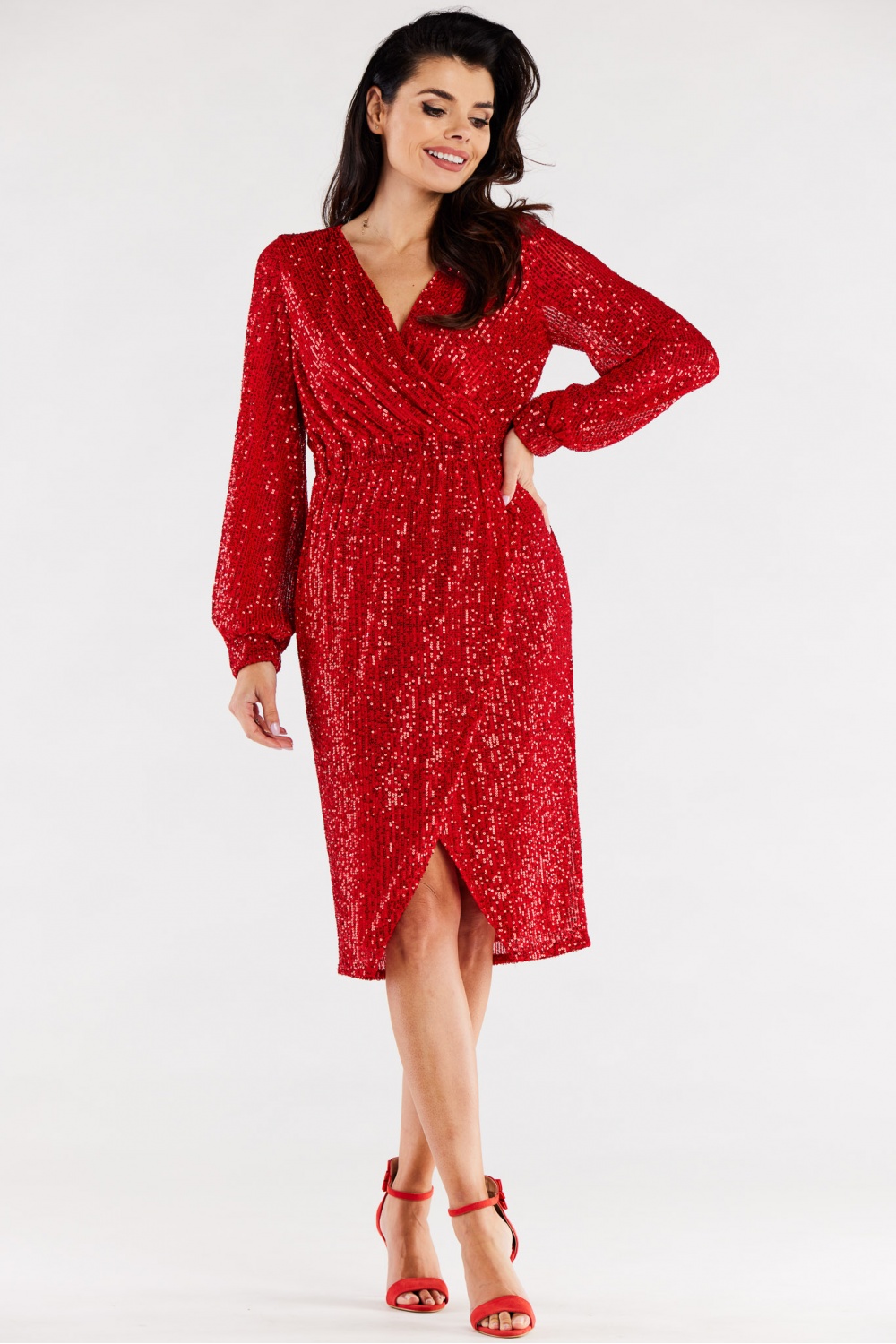 Sukienka kopertowa z cekinów, z szerszym rękawem i marszczonym przy mankiecie. W pasie szeroka guma w celu dopasowania do sylwetki. Sukienka uszyta z elastycznej podszewki. Sukienka wyprodukowana w Polsce.