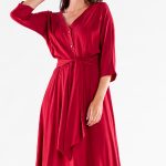 Niezwykle elegancka i kobieca sukienka długości midi. Dekolt ozdabia falbana, zakrywając jednocześnie w subtelny sposób ramiona. Ma wszytą gumkę w talii i dzięki temu dopasowuje się do sylwetki. Zapinana z tyłu na kryty zamek. Idealna na letnie spotkania ze znajomymi i romantyczne wieczory.