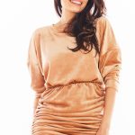 Elegancja i wygoda, ta sukienka to idealny wybór na wiele okazji. Dopasowana góra z głębokim dekoltem subtelnie podkreśla sylwetkę, a rozkloszowany dół dodaje lekkości. Krótkie, marszczone rękawy zakończone gumką nadają jej finezyjnego charakteru, a rozcięcie na boku dodaje nowoczesnego akcentu. Kryty zamek zapewnia wygodę i idealne dopasowanie.