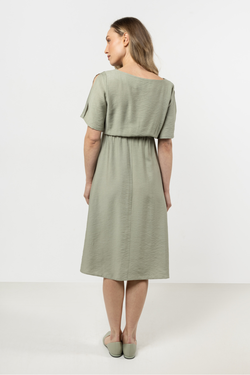 Ta sukienka to idealne połączenie klasyki i wygody. Luźny fason zapewnia swobodę, a gumka w pasie subtelnie podkreśla talię. Krótkie, rozcięte rękawy dodają lekkości, a dekolt w łódkę elegancko eksponuje linię ramion. To uniwersalna propozycja na codzienne i wyjątkowe okazje.