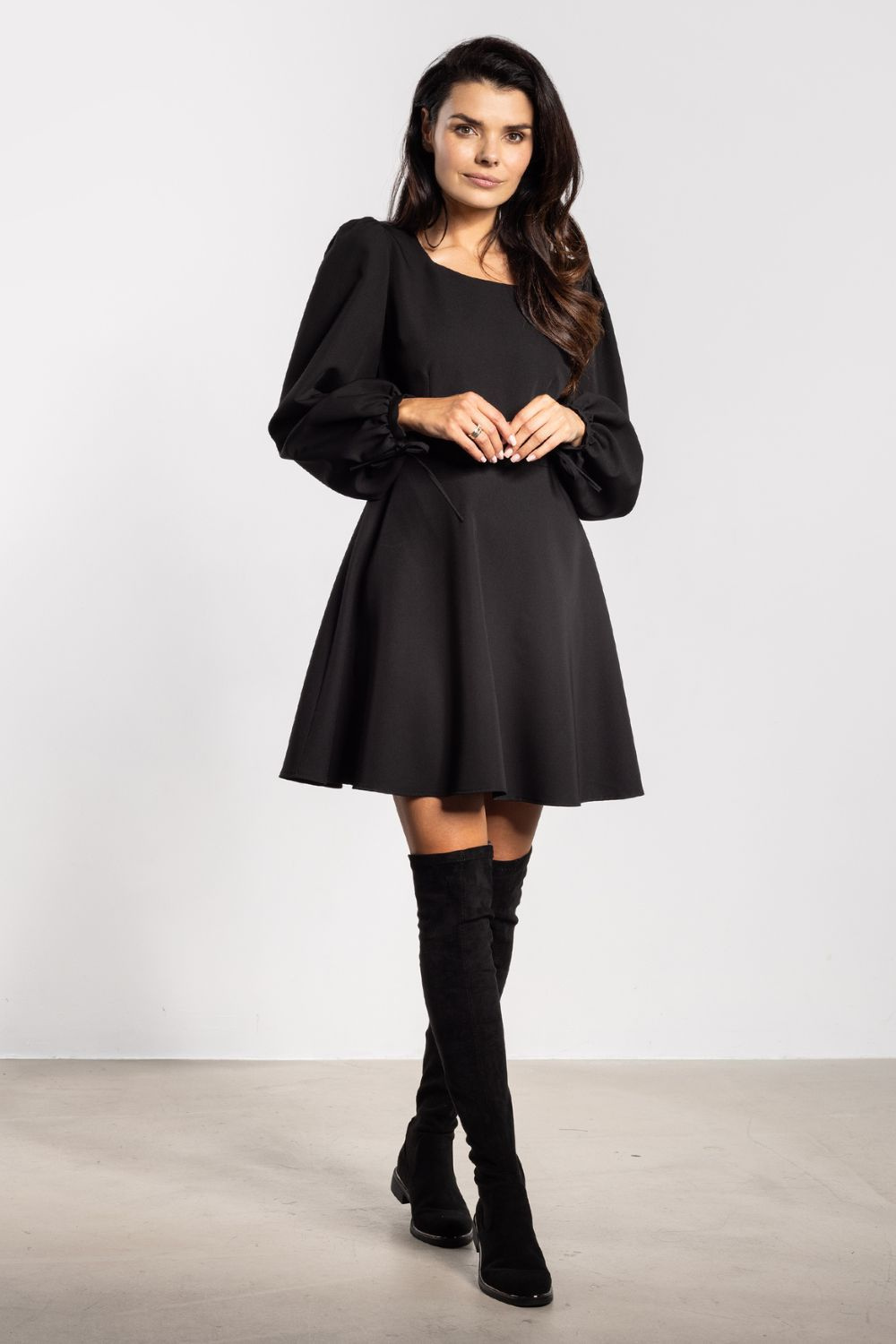 Sukienka mini o rozkloszowanym kroju łączy elegancję z lekkością. Półokrągły dekolt subtelnie podkreśla szyję i ramiona, a ozdobne wiązanie nadaje całości oryginalnego charakteru. Długie bufiaste rękawy zakończone mankietem z gumką dodają lekkości i kobiecego uroku. Rozkloszowany dół miękko układa się w ruchu, zapewniając swobodę i elegancki efekt. Model sprawdzi się zarówno na spotkania towarzyskie, jak i eleganckie okazje.