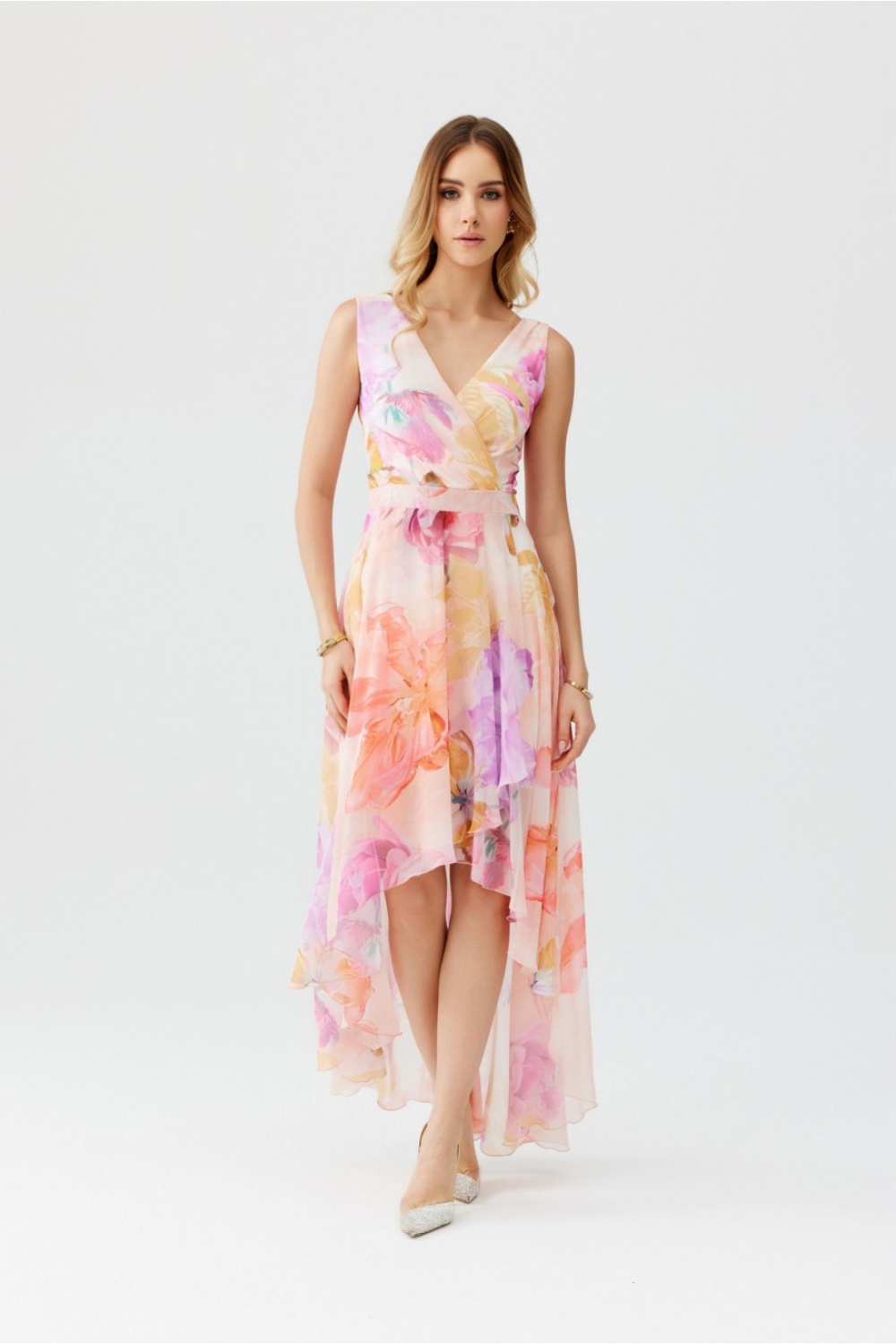 Sukienka maxi wyprodukowana jest z lekkiego i delikatnego szyfonu, który będzie bardzo wygodny w użytkowaniu. Sukienka posiada piękny kopertowym dekolt, który optycznie wydłuży nam sylwetkę oraz pięknie podkreśli biust. Sukienka maxi cechuje się również asymetrycznym krojem, który pozwala na pokazanie nóg i będzie idealnym modelem dla niższych jak i dla wyższych kobiet. Sukienka posiada wszytą halkę, dzięki czemu materiał nie będzie prześwitywał. Ten model sukienki występuje w pięknych kwiatowych printach. Produkt jest wyprodukowany i uszyty w Polsce.
