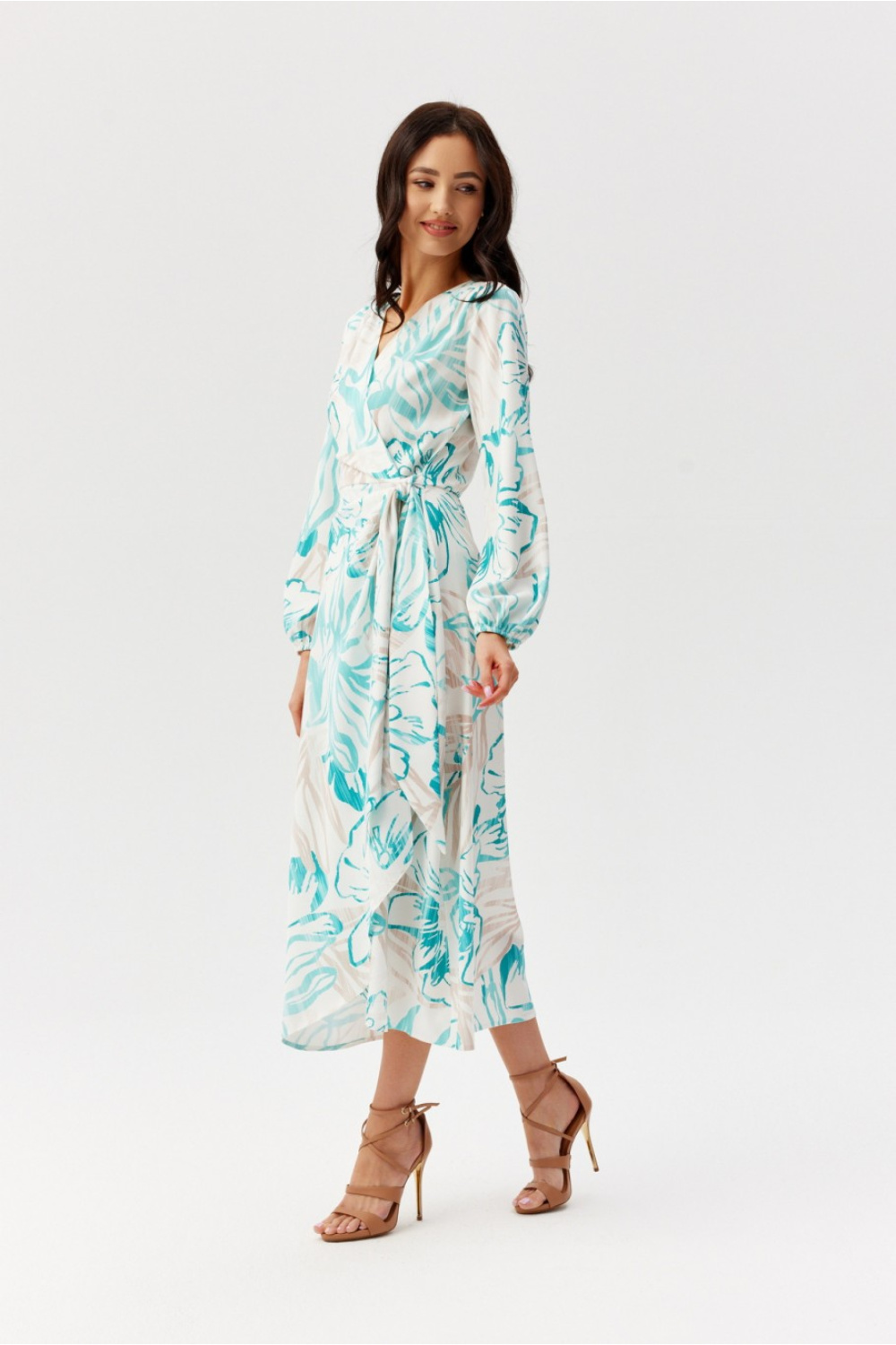 Sukienka midi z długimi rękawami. Góra kopertowa, a dół delikatnie rozkloszowany. Nie posiada podszewki, w pasie podwójne wiązanie.