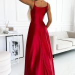 Chiara elegancka maxi długa satynowa suknia na ramiączkach. Pięknie wyprofilowany dekolt i rozcięcie na spódnicy tworzy niecodzienną kompozycję. Uszyta z połyskującej, gładkiej, lekko elastycznej satyny w kolorze czerwonym. Sukienka idealna na wesela, sylwestra, studniówkę, karnawał i inne ważniejsze wyjścia. Produkcja polska. Marka Numoco.