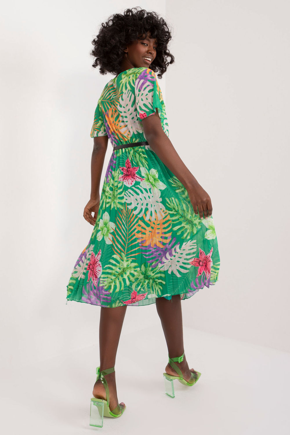 Ta sukienka to kwintesencja codziennej elegancji, która sprawi, że każdy dzień będzie wyjątkowy. Jej rozkloszowany fason zapewnia swobodę ruchów, a zarazem podkreśla kobiecą sylwetkę. Dolna część sukienki ozdobiona jest plisami, dodając lekkości i delikatności całej stylizacji. Wykonana z poliestru, ta sukienka nie tylko prezentuje się świetnie, ale również jest łatwa w pielęgnacji i przyjemna w noszeniu. Jej długość midi sprawia, że jest odpowiednia na wiele okazji, od spacerów po mieście po spotkania ze znajomymi. Krótki rękaw zapewnia komfort noszenia nawet w cieplejsze dni, podczas gdy dekolt kopertowy dodaje sukience subtelnego uroku i kobiecego wyrazu. Sukienka wyposażona jest w zapinany pasek, który podkreśla talię i nadaje sylwetce proporcje. Z podszewką zapewniającą dodatkowy komfort noszenia, ta sukienka to połączenie stylu, wygody i elegancji, które sprawi, że będziesz czuła się pewnie i pięknie każdego dnia. Idealna na codzienne wyjścia, ta sukienka stanie się szybko ulubionym elementem Twojej garderoby.