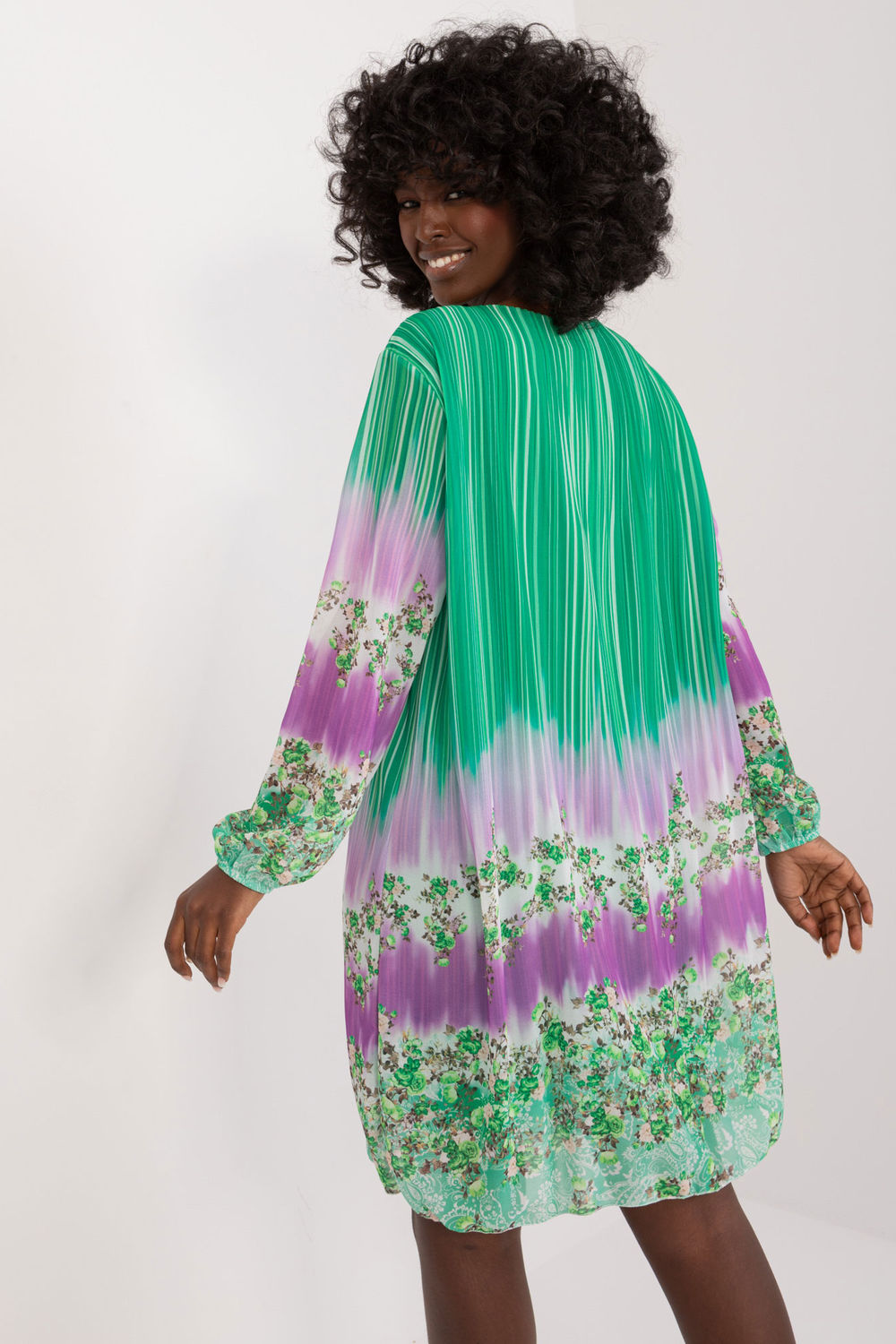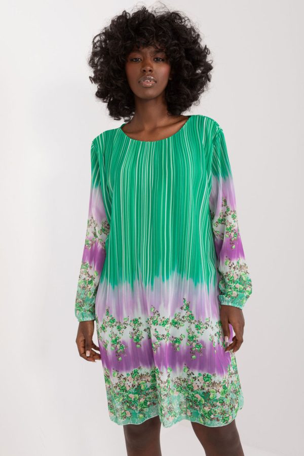 Ta sukienka z kolorowym nadrukiem to doskonały wybór na co dzień. Wykonana z dominującego poliestru, zapewnia wygodę i trwałość. Jej długość przed kolano oraz prosty fason sprawiają, że jest uniwersalna i łatwa do zestawienia z różnymi elementami garderoby. Sukienka posiada okrągły dekolt, który nadaje jej klasycznego wyglądu, a długie rękawy zapewniają komfort noszenia w chłodniejsze dni. Kolorowy nadruk dodaje jej charakteru i ożywia każdą stylizację. To idealna propozycja na casualowe wyjścia, kiedy chcesz wyglądać stylowo i czuć się swobodnie.