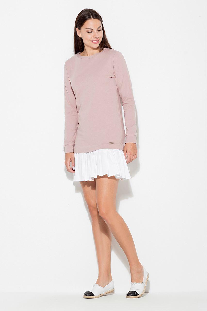 Model z długim rękawem wykonany z bawełny dodaje komfortu noszenia. Minimalistyczny krój w połączeniu z falbanką nadaje wdzięku i delikatności w codziennym użytkowaniu. Model świetnie sprawdzi się w wersji z tenisówkami.