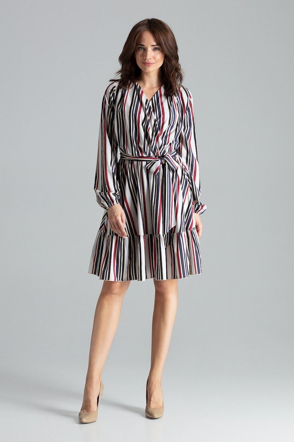 Sukienka midi w paski z długim rękawem zakończonym marszczeniem z wszytą gumką. Kopertowy dekolt. Spódnica z falbaną w dolnej części, w pasie odcinana, wszyta gumka oraz dodatkowo szarfa do wiązania.