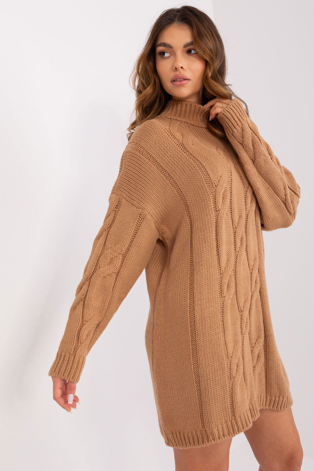Ta sukienka to idealne połączenie wygody, stylu casual i subtelnej elegancji. Jej urozmaicona faktura materiału nadaje jej unikalny charakter, a długi rękaw sprawia, że jest doskonała na chłodniejsze dni. Golf dodaje sukience nuty nowoczesności i sprawia, że staje się ona ponadczasowym elementem garderoby. Długość przed kolano sprawia, że sukienka jest uniwersalna i pasuje do wielu okazji, zarówno do codziennego noszenia, jak i do pracy. Dzięki starannie dobranym materiałom, sukienka jest nie tylko modna, ale również komfortowa. To doskonały wybór dla kobiet ceniących sobie wygodę, styl i oryginalność w jednym.