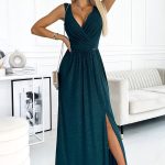 Długa brokatowa suknia maxi z głębokim dekoltem, szerokimi ramiączkami i rozcięciem na nodze. Sukienka w kolorze zieleni butelkowej z brokatem. Sukienka pięknie eksponuje dekolt i świetnie układa się w tańcu. Zapinana z tyłu na kryty zamek. Produkt polski. Marka numoco.