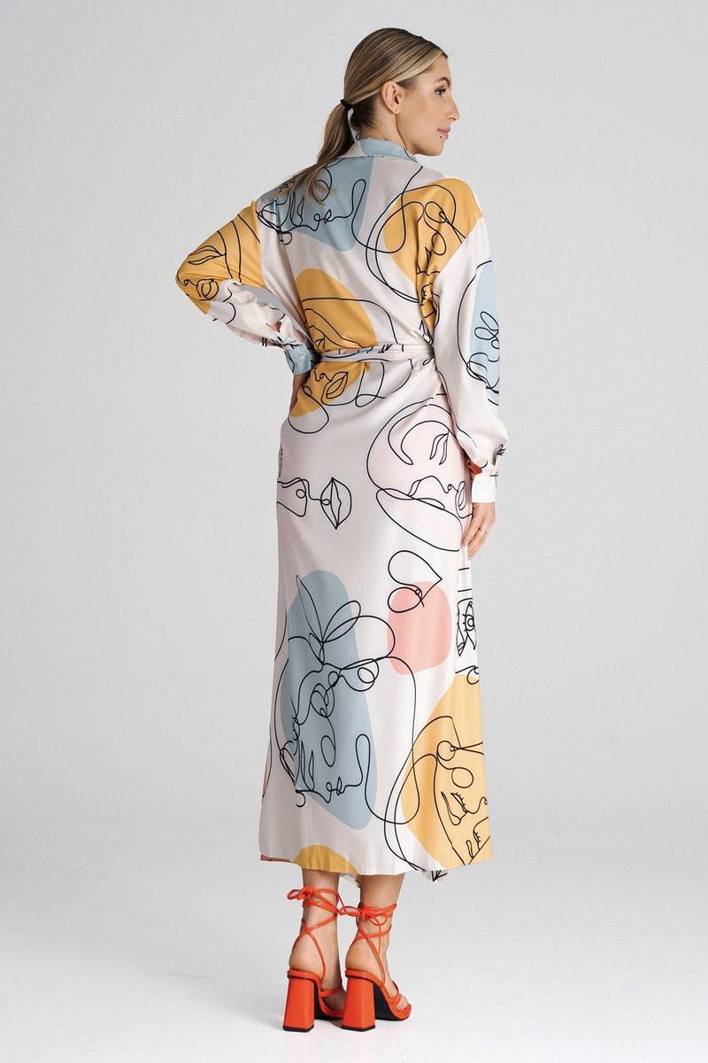 Koszulowa sukienka maxi z kołnierzykiem. Na linii biustu ozdobne patki. Długi rękaw wykończony mankietem zapinanym na guzik. Sukienka zapinana na guziki, wiązana w pasie. Rozcięcia po bokach. Sukienka bez kieszeni oraz podszewki.
