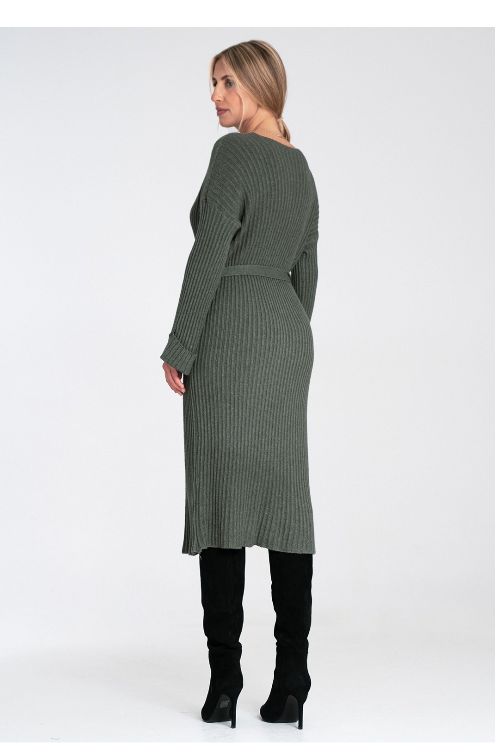 Dzianinowa sukienka midi o eleganckim, a zarazem komfortowym kroju. Z przodu ozdobiona dekoracyjnymi guzikami, które nadają jej wyjątkowego charakteru. Posiada długie, lekko rozkloszowane rękawy oraz dekolt w serek podkreślający kobiecy styl. Wiązanie w pasie akcentuje talię i pozwala na idealne dopasowanie.