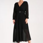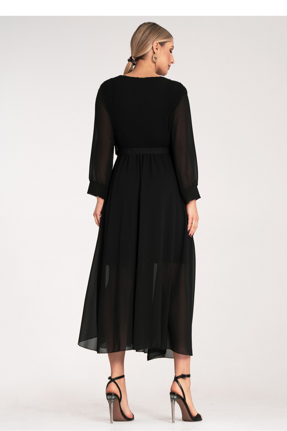 Sukienka maxi z plisowanym, zakładanym dekoltem. Długi rękaw zakończony mankietem, w talii pasek.