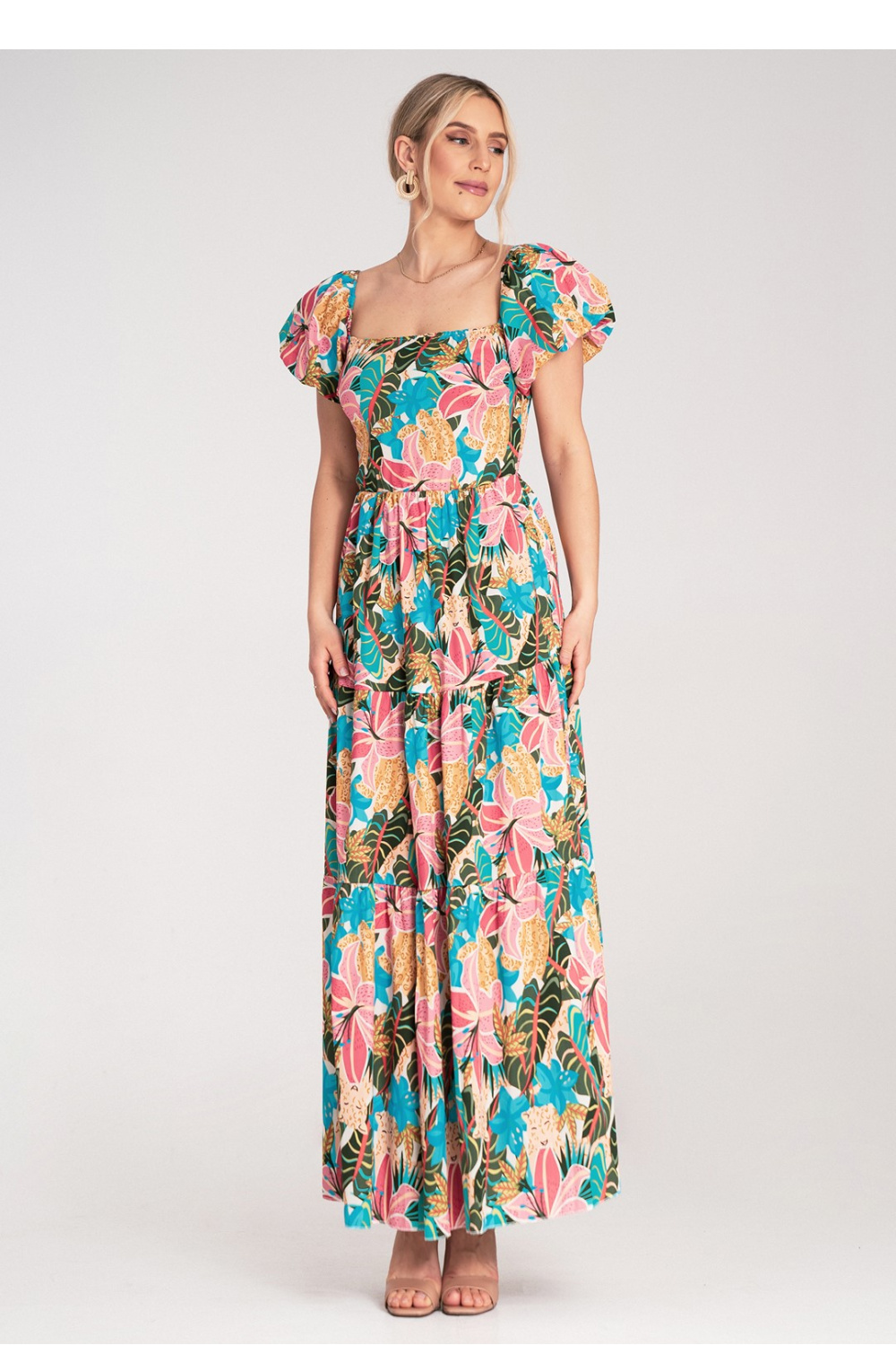 Sukienka maxi z kwadratowym dekoltem i krótkimi, bufiastymi rękawami zakończonymi gumką. Góra elastyczna, z marszczeniami z tyłu, dopasowująca się do sylwetki. Dół rozkloszowany, uszyty z trzech szerokich, marszczonych poziomów.