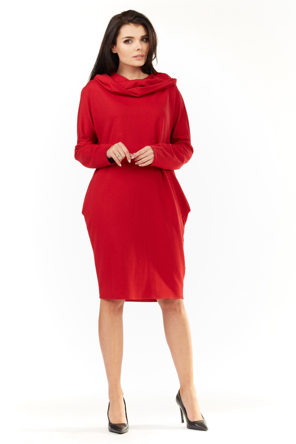 Dzianinowa sukienka z długim rękawem. Sukienka o luźnym kroju z kapturem. Sukienka posiada po bokach kieszenie. Idealna na wiele okazji.