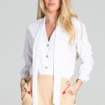 Beżowa wiosenna sukienka midi w kratkę, delikatnie taliowana, kwadratowy dekolt, krótki, bufiasty rękaw z mankietem.