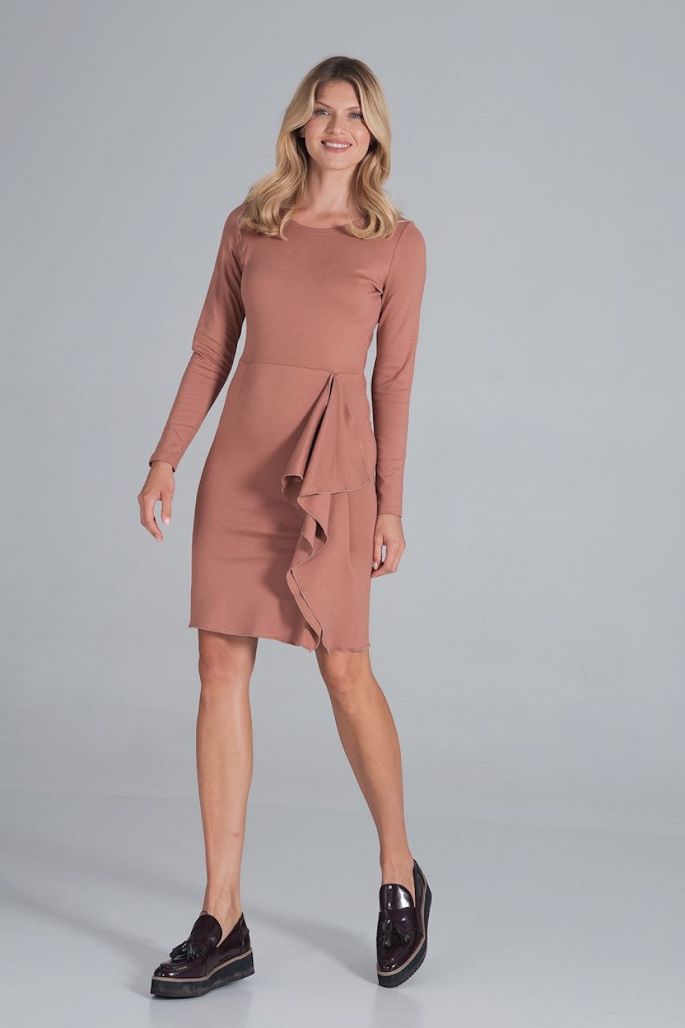 Sukienka koktajlowa z długim rękawem oraz półokrągłym dekoltem. Dół sukienki prosty z draperią na lewej nodze. Sukienka bez zapięcia.