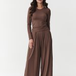Dresowa sukienka to propozycja o klasycznym, ale nowoczesnym kroju. Model ma długość midi, sięgającą poniżej kolan, z dopasowaną górą i delikatnie rozszerzaną spódnicą. Wykonana jest z elastycznego materiału, który dobrze dopasowuje się do sylwetki, zapewniając wygodę noszenia. Kopertowy dekolt dodatkowo dodaje sukience elegancji i podkreśla linię biustu. Pod biustem znajduje się elastyczny, szeroki pas wykonany ze ściągacza, który optycznie wyszczupla talię i dodaje sylwetce proporcji. Model posiada długie rękawy, co czyni go idealnym na chłodniejsze dni. Po bokach sukienki znajdują się kieszenie, co dodaje jej praktyczności i luźnego charakteru oraz rozcięcia, które podkreślają kobiecość i ułatwiają poruszanie się. Sukienkę można zestawić z czarnymi workerami, co nadaje stylizacji nieco bardziej zadziornego charakteru, idealnego na jesienne dni lub sportowym obuwiem gdzie zyska na bardziej luźnym, sportowym wizerunku. Ta sukienka to idealna propozycja na co dzień, ale także na bardziej formalne okazje, dzięki połączeniu elegancji z funkcjonalnymi detalami.
