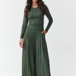 Ta sukienka jest doskonałym przykładem elegancji połączonej z wygodą. Model ma prosty, lekko dopasowany krój o długości midi, który podkreśla sylwetkę, a jednocześnie zapewnia komfort. Natomiast subtelne rozcięcie z tyłu sukienki nie krępuje ruchów. Wykonana jest z miękkiego, elastycznego materiału dresowego, który dobrze układa się na ciele, co czyni ją idealną na wiele okazji. Dekolt wykończony ściągaczem, w kształcie litery V dodaje sukience subtelnej elegancji i delikatnie wysmukla szyję. Długie rękawy są zakończone szerokimi ściągaczami, co nadaje całości klasyczny wygląd. Rękawy posiadają lekkie bufki przy ramionach, co dodaje sukience nowoczesnego charakteru. Taka kreacja jest idealna na codzienne wyjścia, spotkania z przyjaciółmi, czy nawet do pracy, gdzie panuje nieformalny dress code. Ponadto model łączy w sobie klasykę z nutą nowoczesności, co sprawia, że jest wszechstronnym elementem garderoby.