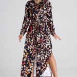 Ołówkowa sukienka midi z kopertowym dekoltem, odcinana w pasie z zaszewkami i ozdobnymi guzikami imitującymi kieszenie. Krótki rękaw, zapinana z tyłu na zamek, bez podszewki.