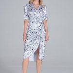 Satynowa koktajlowa sukienka midi. Kopertowy dekolt, bufiasty rękaw do łokcia, półokrągłe rozcięcie na lewej nodze wykończone ozdobnym regulowanym marszczeniem. Zapinana z boku na zamek, bez podszewki.