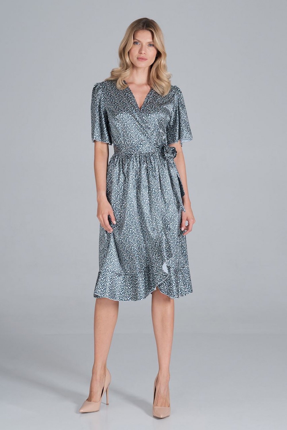 Satynowa kopertowa sukienka midi z szerokim krótkim rękawem, wiązana w pasie, rozkloszowany dół z falbaną. Sukienka bez podszewki.