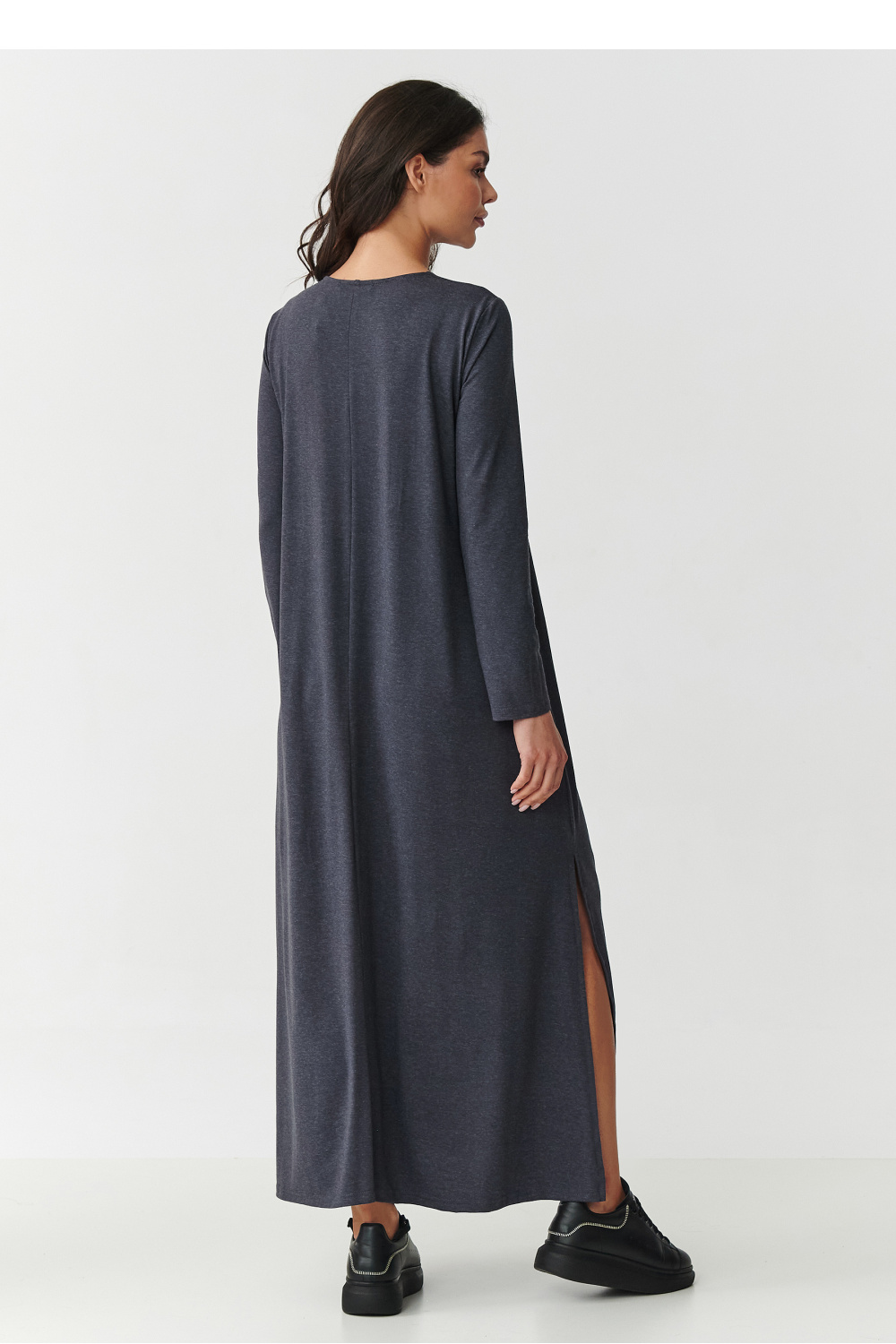 Postaw na ponadczasową klasykę i maksymalny komfort! Nasza długa sukienka maxi uszyta z wysokiej jakości wiskozy z dodatkiem elastanu to idealny wybór zarówno na co dzień, jak i na wyjątkowe okazje. Dzięki naturalnej przewiewności wiskozy oraz elastyczności tkaniny, sukienka pięknie układa się na sylwetce, nie krępując ruchów. Model posiada dekolt w literę V, który subtelnie podkreśla kobiece kształty, a lekko rozkloszowany krój z rozcięciami po bokach dodaje lekkości i nowoczesnego charakteru. Długie rękawy sprawiają, że sukienka sprawdzi się o każdej porze roku ? możesz ją nosić zarówno wiosną i latem, jak i jesienią czy zimą w połączeniu z botkami lub kozakami. Dostępna w modnych kolorach: czekoladowy- głęboki, elegancki odcień, który podkreśla urodę i dodaje klasy, czarny ? ponadczasowa klasyka, niezastąpiona w każdej garderobie, khaki ? stylowy i uniwersalny kolor w militarnym klimacie oraz antracytowy ? głęboki, ciemnoszary odcień idealny na eleganckie i casualowe stylizacje. Ta sukienka maxi to doskonały wybór dla kobiet ceniących komfort, minimalizm i elegancki styl. Świetnie wygląda zestawiona zarówno ze sportowymi sneakersami, jak i eleganckimi butami na obcasie.
