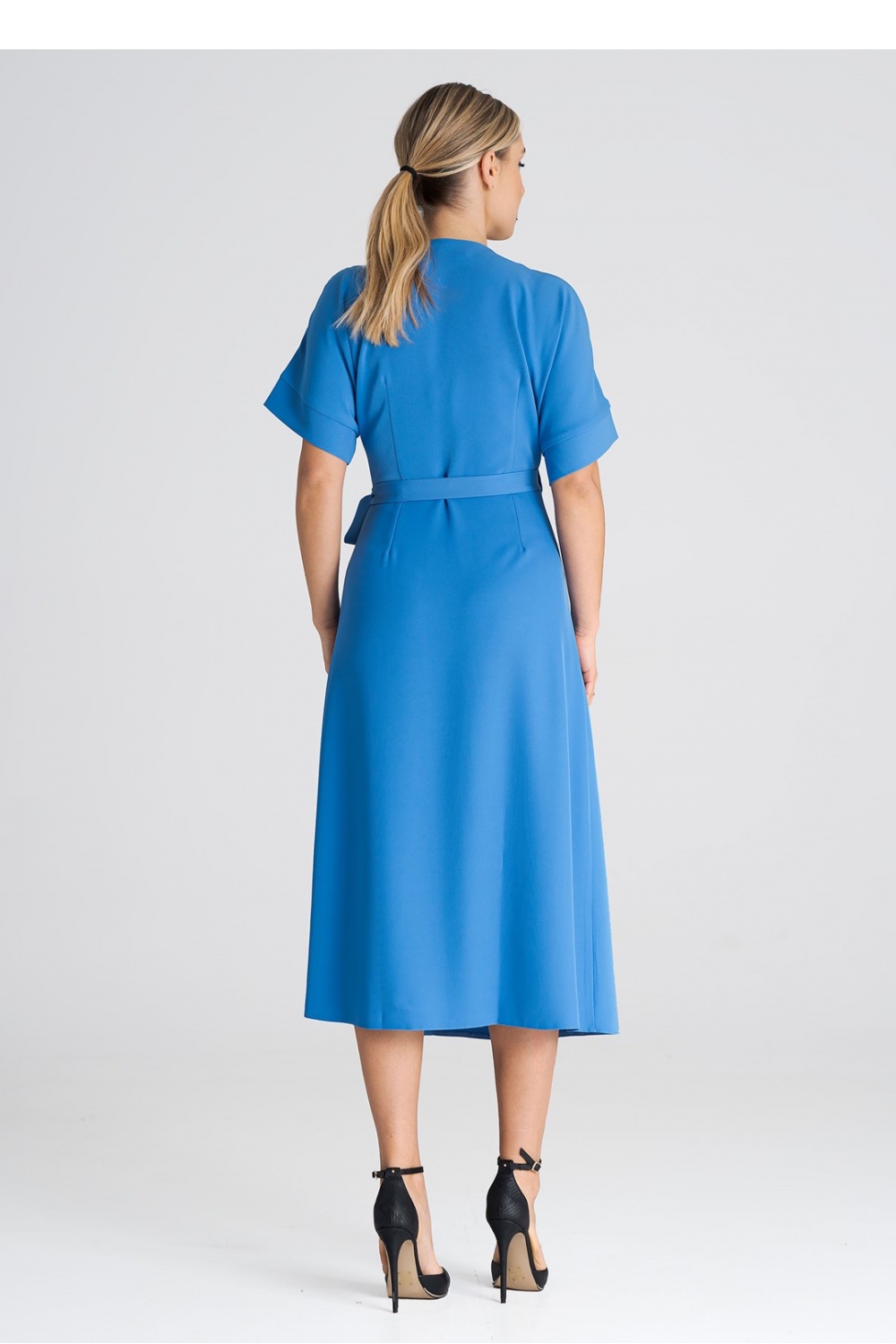 Sukienka z krótkim rękawem typu kimono, zakończonym mankietem. Przód kopertowy z wiązaniem w pasie. Propozycja idealna na co dzień i nie tylko.
