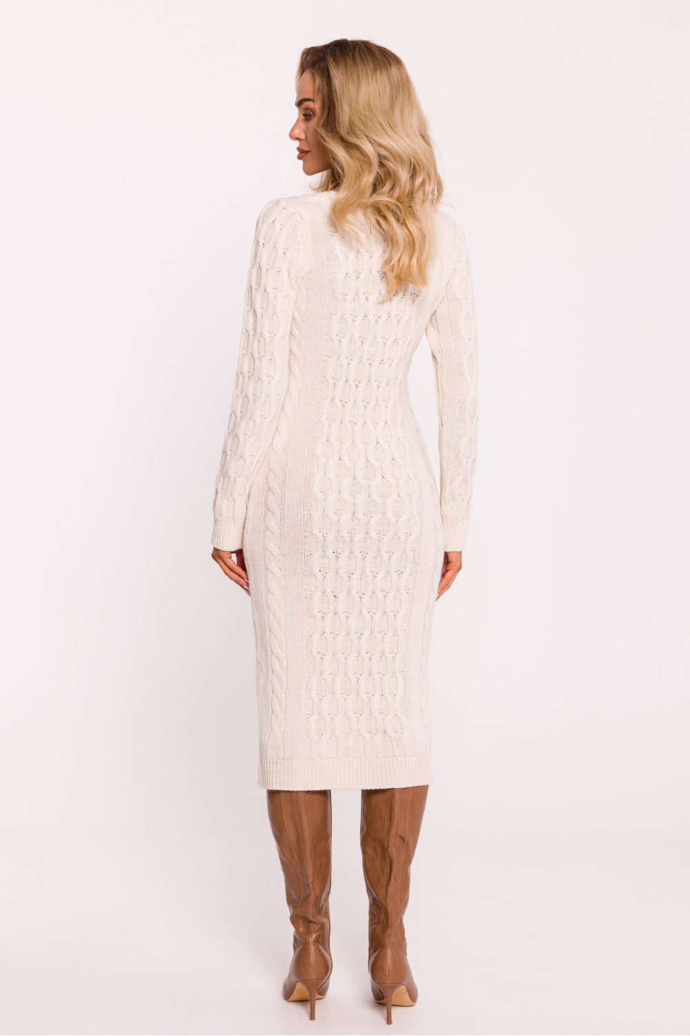 Sukienka swetrowa o dopasowanym fasonie, wykonana z przędzy o różnorodnym splocie, która nadaje jej unikalną fakturę i miękkość. Posiada długi rękaw oraz dekolt w kształcie litery V, podkreślający szyję i dodający elegancji. Długość midi zapewnia komfort i wszechstronność, idealna na różne okazje. Całość została zaprojektowana i uszyta w Polsce, co gwarantuje wysoką jakość wykonania oraz dbałość o detale.