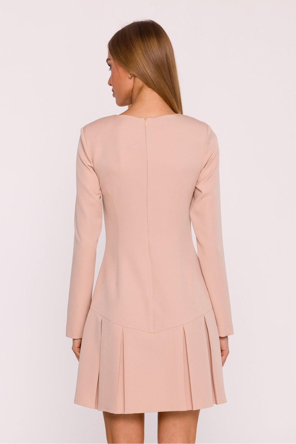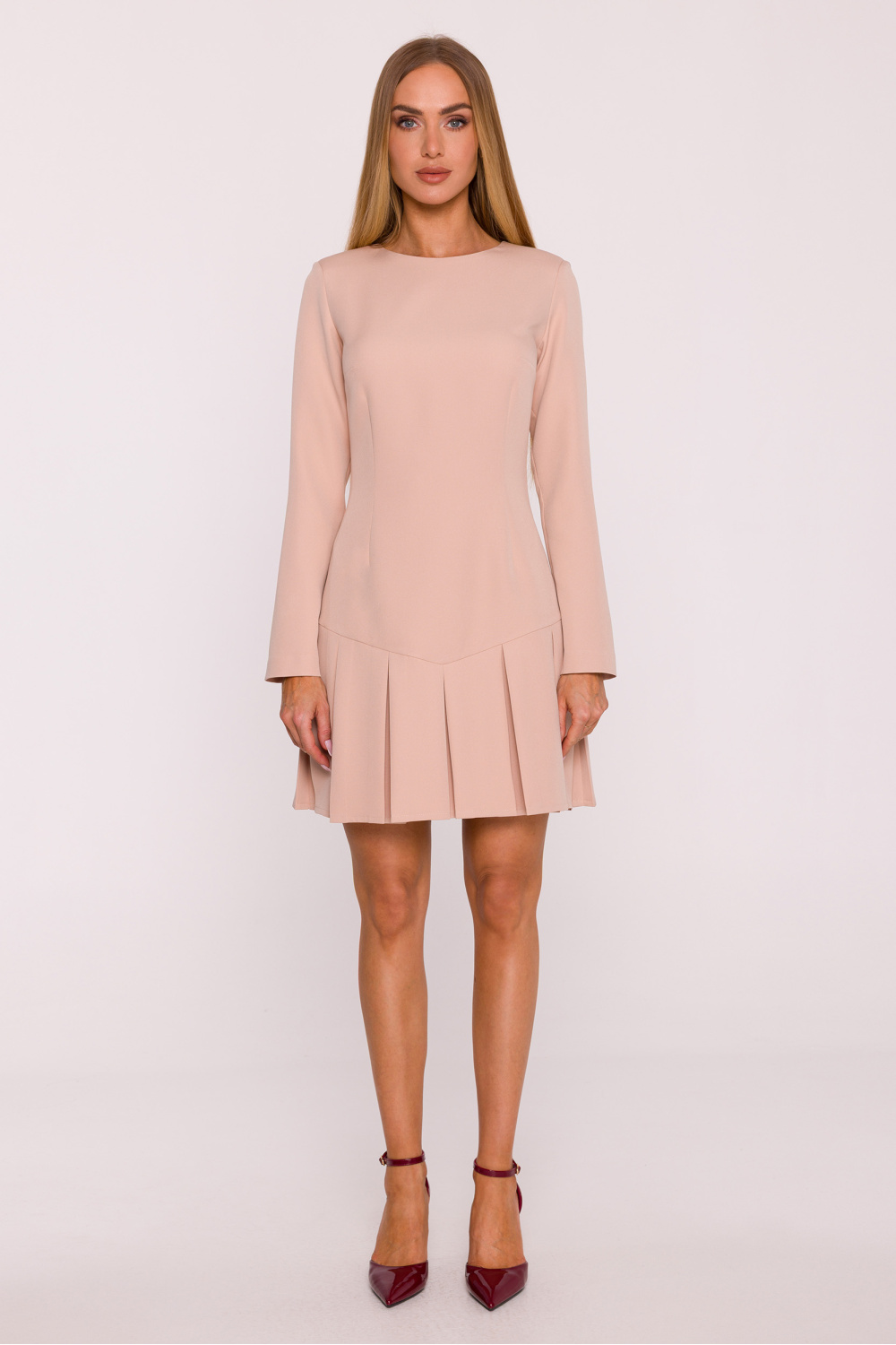 Klasyczna sukienka wykonana z gładkiej tkaniny o matowym wykończeniu to propozycja, która łączy prostotę i elegancję w nowoczesnym wydaniu. Minimalistyczny design sprawia, że doskonale sprawdzi się zarówno w codziennych stylizacjach, jak i podczas bardziej formalnych okazji. Model ma subtelny dekolt w kształcie łódki oraz długie rękawy, które nadają całości ponadczasowego charakteru. Sukienka zapinana jest na kryty zamek z tyłu, co zapewnia wygodę i estetyczne wykończenie. Fason lekko dopasowany w górnej części został urozmaicony dołem w kontrafałdy, które dodają sylwetce lekkości i kobiecego wdzięku. Prosta, taliowana linia subtelnie podkreśla figurę, a mini długość nadaje sukience nowoczesnego, dziewczęcego charakteru. Zaprojektowana i uszyta w Polsce, stworzona z myślą o kobietach, które cenią ponadczasową elegancję w minimalistycznej formie.