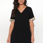 Nowoczesna i stylowa krótka sukienka dresowa, która łączy wygodę z modnym designem. Posiada nieoczywiste wycięcie na plecach, które nadaje jej subtelnego zmysłowego charakteru, ozdobione biżuteryjną blaszką w złotym kolorze. Sukienka jest zabudowana z przodu, w dolnej części posiada delikatne rozcięcia, co nadaje jej lekkości i swobodnego charakteru. Posiada bardzo swobodny fason, co czyni ją doskonałym wyborem na swobodne i aktywne spotkania ze znajomymi. W zależności od dodatków, wystylizujesz ją dokładnie tak, jak lubisz najbardziej!